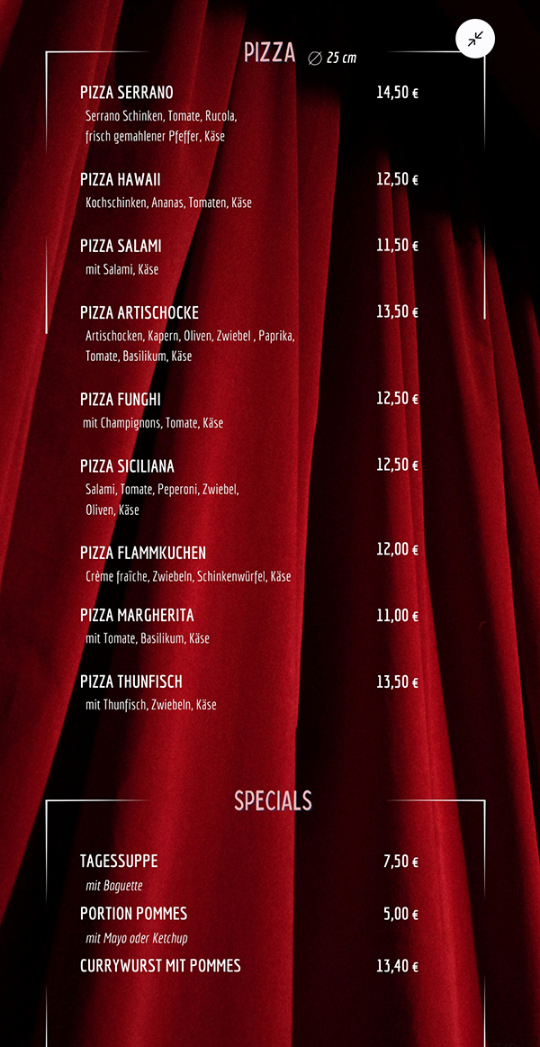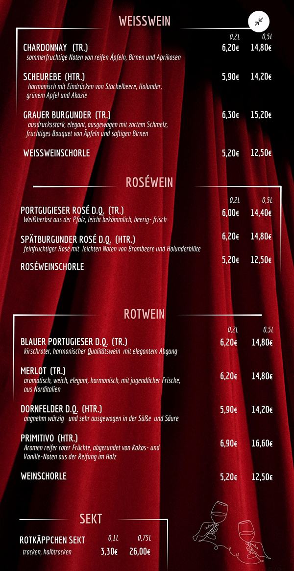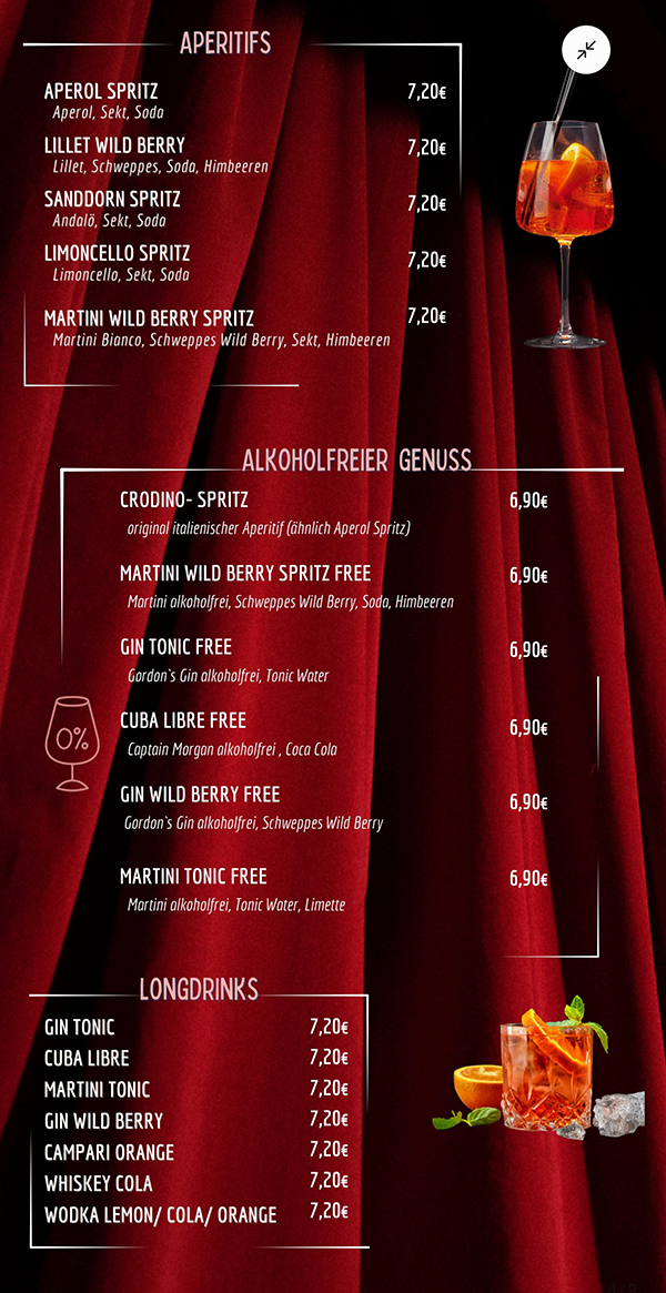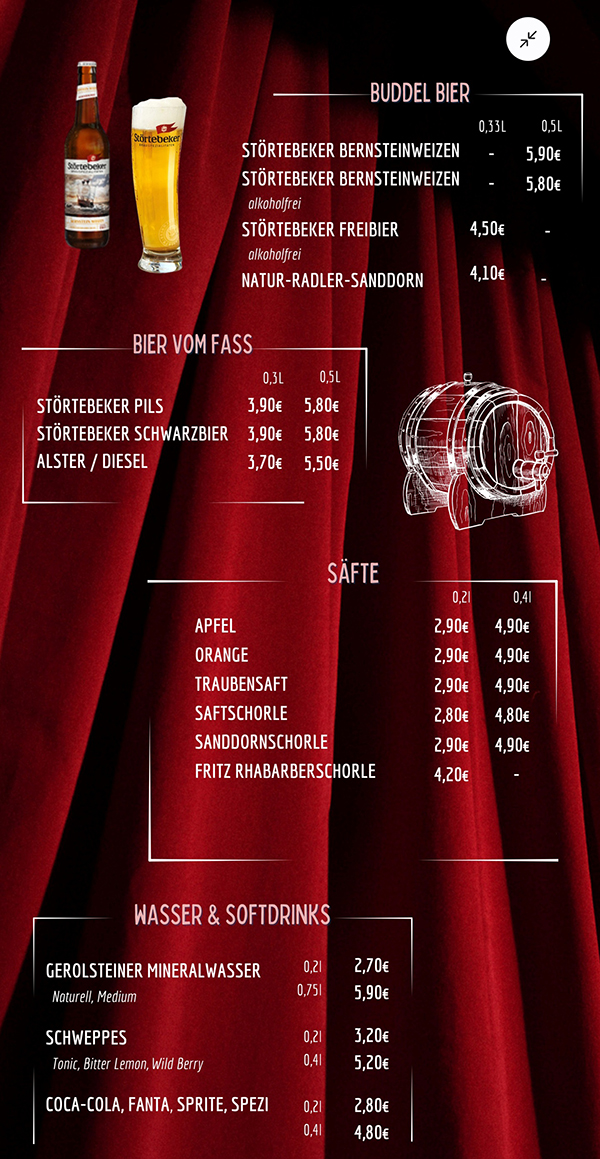 Unsere Gastronomie erwartet Sie an Veranstaltungstagen ab 18.30 Uhr direkt im Theatersaal. Genießen Sie also vor der Vorstellung eine leckere Pizza. Selbstverständlich haben wir ein großes Getränkeangebot und servieren Ihnen Störtebeker Bier, erlesene Weine und Longdrinks. So können Sie nicht nur kulturell, sondern auch gastronomisch einen schönen Abend erleben.